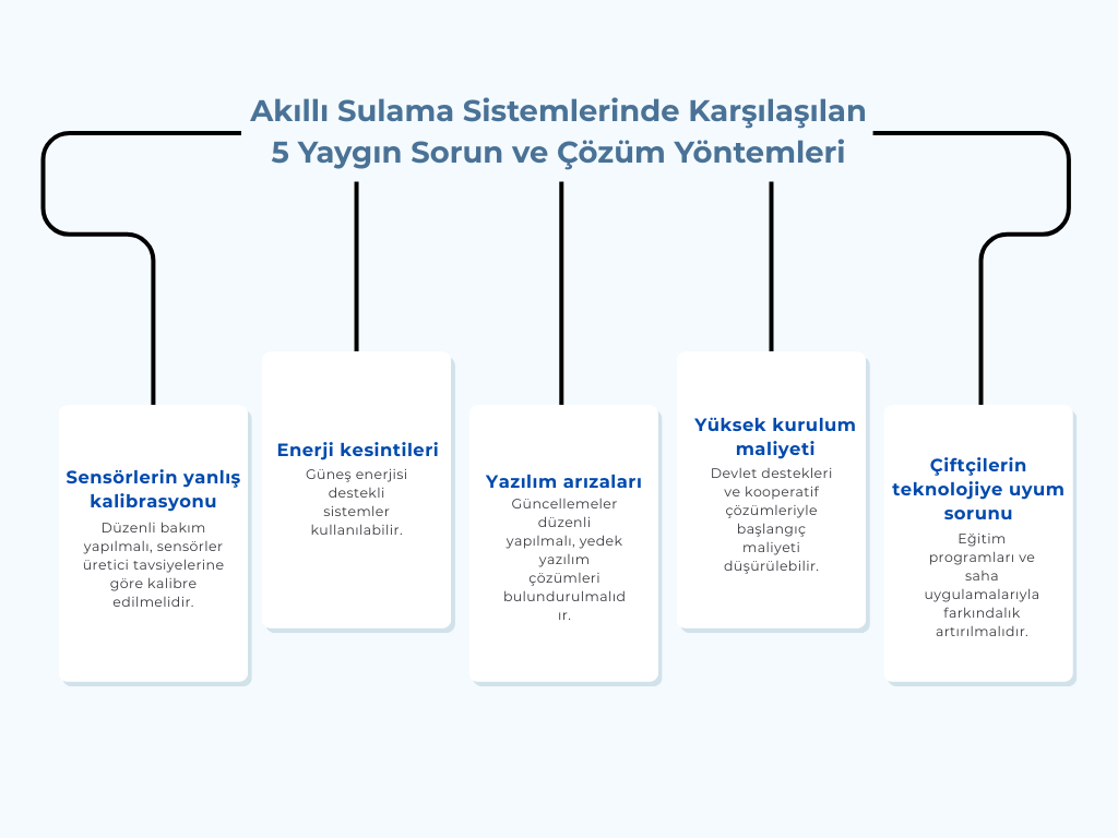 Akıllı sulama sistemlerinde en sık karşılaşılan sorunlardan biri sensörlerin doğru çalışmamasıdır. Yanlış kalibrasyon yapıldığında sensörler toprağın nemini hatalı ölçer ve sulama döngüsü bozulur. Bu nedenle sensörlerin düzenli aralıklarla kontrol edilmesi ve üretici talimatlarına uygun şekilde ayarlanması gerekir.